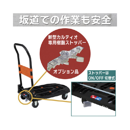樹脂ストッパーの採用で少々の傾斜でも台車本体をそのまま保持できます。