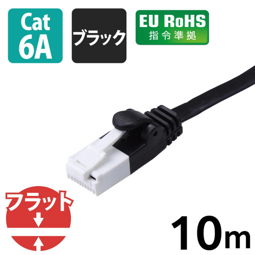 10ギガビット・イーサネットに対応したCat6A LANケーブル。薄さ約1.4mmで設置場所を選ばないフラットケーブルと、ツメが折れにくいコネクターを採用。 ※1000回の屈曲検査に合格(当社検証)