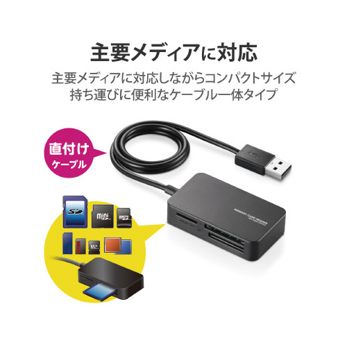 主要メディアに対応しながらコンパクトサイズを実現。持ち運びに便利なケーブル一体タイプの小型メモリリーダライタ。