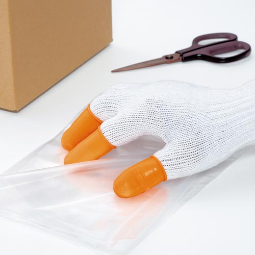 フィット感がある指サック。表面は滑り止めエンボス形状。軍手の上からでも使用できます。
