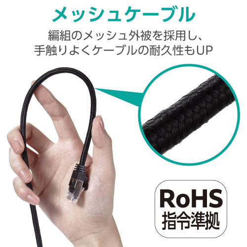 高速光通信に最適な40ギガビットイーサネットに準拠し、高速で安定したネットワーク環境を実現するCat8準拠LANケーブルのメッシュタイプです。