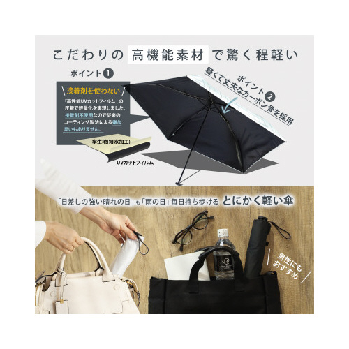新素材のラミネートフィルム加工生地を使用し最高基準の日傘性能と雨傘との両立、カーボン骨仕様でしなやかで壊れにくい