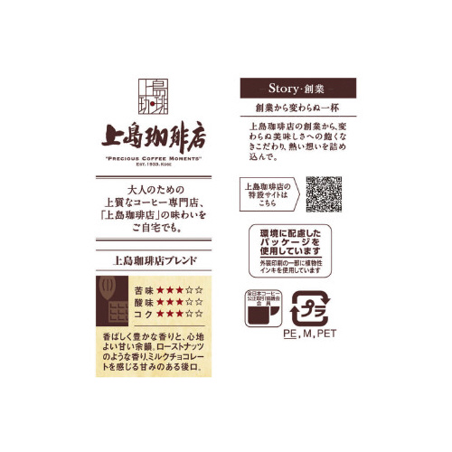 大人のための上質なコーヒー専門店「上島珈琲店」の味わいを、ご家庭でも。上島珈琲店の創業から、変わらぬ美味しさへの飽くなきこだわり、熱い想いを詰め込んで。