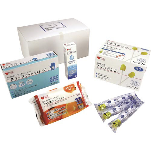 ●セット内容/口腔ケア用スポンジ「マウスポンジふつうプラ軸50本」、口腔ケア用ジェル「マウスモイスト72g」、口腔ケア用ウエットシート「マウスティシューオレンジ60枚」、口腔ケア用使い捨て手袋「ミルキーフィットグローブ200枚」(食品衛生法適合)