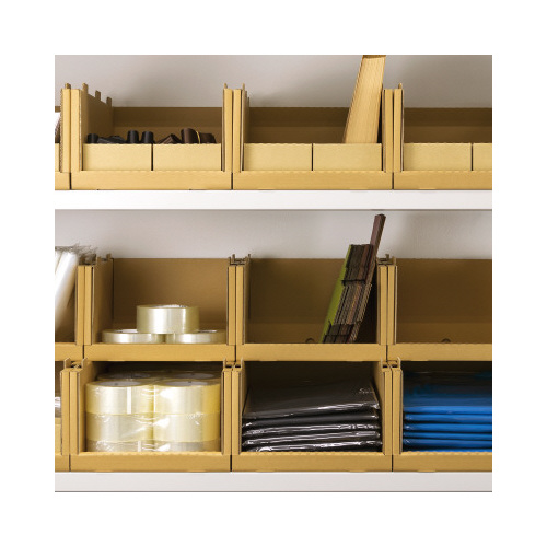 スチールラックはもっと使える!オフィスやバックヤードの整理に最適な、ダンボール製の組み立て式システムトレーです。同一サイズ・異なるサイズもスタッキングできるから、使い方の幅が広がります。