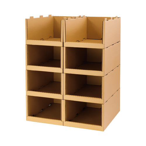 スチールラックはもっと使える!オフィスやバックヤードの整理に最適な、ダンボール製の組み立て式システムトレーです。同一サイズ・異なるサイズもスタッキングできるから、使い方の幅が広がります。