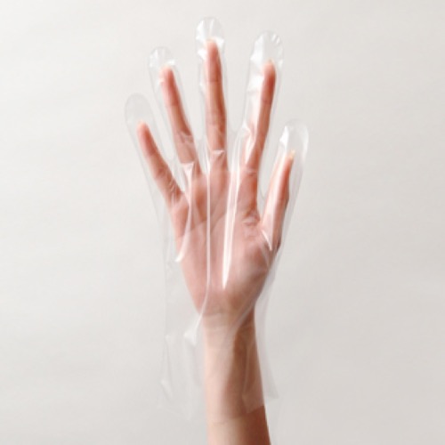具材がくっつきにくい外エンボス加工のポリエステル製使い捨て手袋です。半透明で清潔感があります。サイズ違いで4種類をご用意。