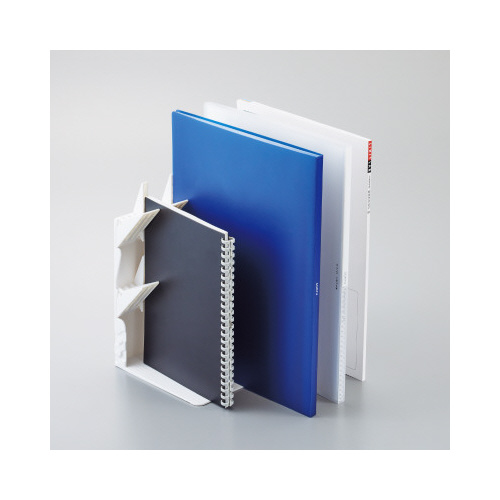 本を抜き取っても隣の本が倒れないブックスタンド(A4対応の新サイズ)。上下のストッパーが本をしっかり支え、抜き取っても隣の本が倒れない。両サイドのジョイントで別部品なしで連結。通常サイズとも連結可能。