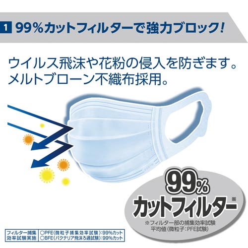 超極細の「高機能フィルター」でウイルスや花粉を強力ブロック。3層構造と超極細高機能フィルター採用で、ウイルス飛沫や花粉の侵入を防ぎます。安心の国内生産。BFE、PFE99%カット