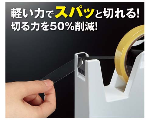 独自の特殊加工刃で約1/2の軽い力でテープを切ることができます(コクヨ従来品比)。切ったテープの切り口はまっすぐキレイです。刃の交換は簡単です。刃はテープののりが付きにくく、切り心地が長持ちします。