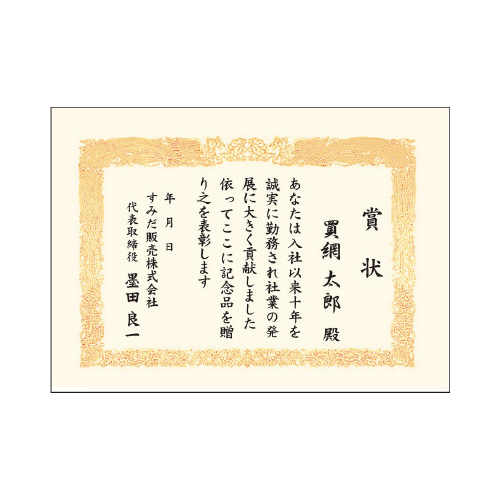 金箔仕様で紙厚がある豪華なプリンタ対応賞状用紙です。(コピー,レーザー,インクジェット)手書き用としてもお使い頂けます。賞状のさまざまな内容のテンプレートをホームページより無料ダウンロードできます。