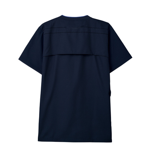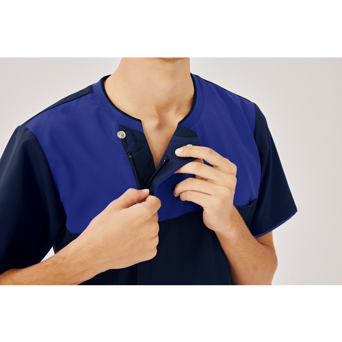●商品の特徴2/スクラブ内の熱や不快感を排出してくれて、オールシーズン快適な着心地です。使用しているアリオンストレッチは、軽くて丈夫な素材で伸縮性のよいストレッチ生地。動きやすさはもちろん、ポリエステル100%で優れたイージーケア性も魅力です。メンズらしいクールな落ち着いた色合いながら、丸首のデザインにすることで、柔らかく優しい印象のスクラブに。ゆとりのあるシルエットなので、幅広い職種や体型の方に着用いただけます。羽織って着られるジップタイプで着脱が楽チン。デザイン性・機能性ともに優れている快適メンズジップスクラブです。