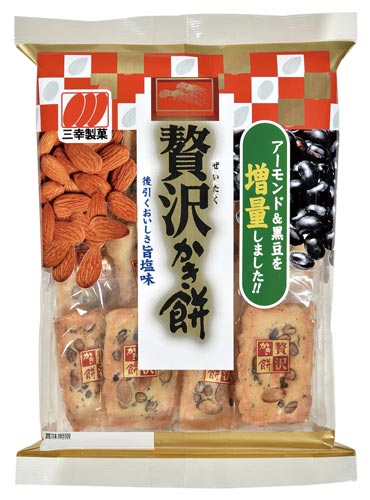 「焼のり巻」「黒のり巻」の海苔巻2種と「サラダ」「ざらめ」のおかき2種のミックス。風味豊かな味わいが楽しめる海苔巻とおかきミックス。便利な個包装。