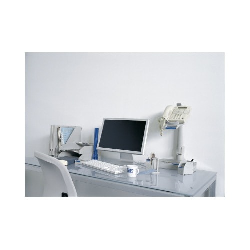 360度回転、手前に引き出せるリフトタイプだから、1台の電話を最大4人で共有できる。その分デスクスペースを効率的に使える電話台です。電話を設置するトレー部分は5段階に調整可能です。