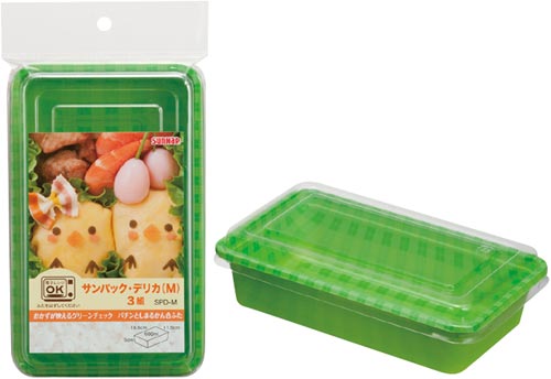 おかずが映えるグリーンチェックの弁当容器。本体電子レンジOK。(蓋を外してください)パチンと閉まるかん合蓋とセットの3組入。