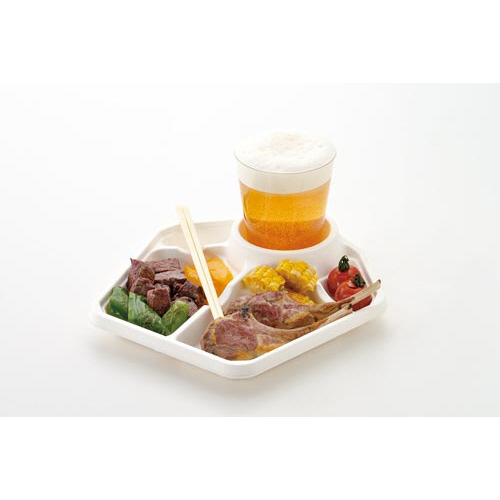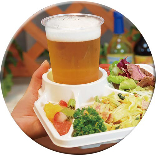 ドリンクホルダーも付いて料理も片手で持てる。立食パーティー等に便利なパーティートレー。紙製なので環境にもやさしい。