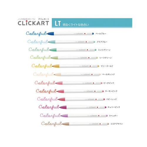 片手で使えるノック式のサインペン「クリッカート」の明るくライトな12色セット。キャップの閉め忘れがなく、裏移りをせず、他の色と重ねてもにじみません。塗り絵、イラスト、ノートをきれいにデザインできます。