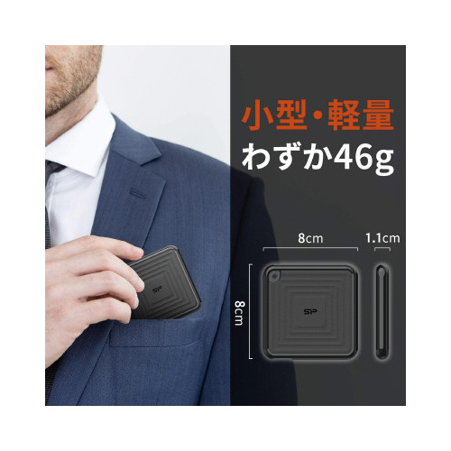 縦横が80mm、46gの小型ポータブルSSDです。ポケットに収まるスリム形状で、持ち運びに最適です。
