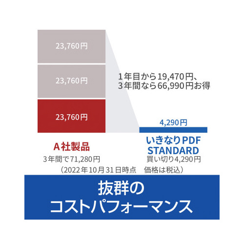 「いきなりPDF」シリーズの一通りの作業をこなせる標準モデル。PDFの作成、組み替え、編集に加え、PDFの他形式への変換もできる。