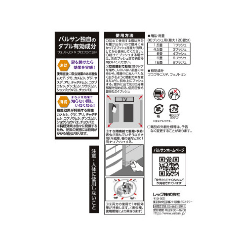 ※皮膚、目、飲食物、食器、子供のおもちゃ、ペット類(観賞魚・小鳥など)、飼料、植物、電気・電子機器(テレビ、パソコン、オーディオ機器など)、塗料面、プラスチック、家具、建材、繊維製品、石材、真鍮などに直接スプレーしない。特に観賞魚などの水槽や昆虫の飼育カゴがある部屋では使用しない。