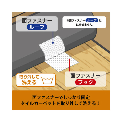 キレイにはがせるタイルカーペット固定用テープです。テープのベース素材に面ファスナーを使用し、タイルカーペット側のテープは貼ったまま洗うことができ、洗うたびにテープを貼り替える必要がありません。