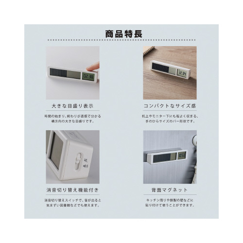 ●仕様/表示方法:液晶デジタル、タイマー桁数:4桁、目盛り個数:20個、タイマー:通常計測、カウントダウン:最大計測時間99分50秒