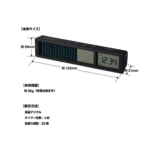 ●仕様/表示方法:液晶デジタル、タイマー桁数:4桁、目盛り個数:20個、タイマー:通常計測、カウントダウン:最大計測時間99分50秒