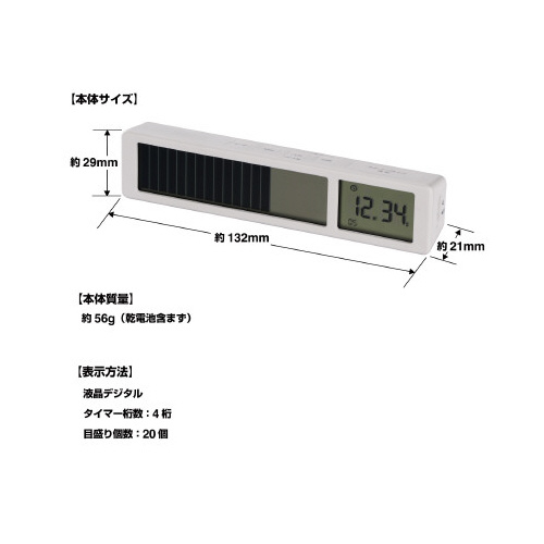 ●仕様/表示方法:液晶デジタル、タイマー桁数:4桁、目盛り個数:20個、タイマー:通常計測、カウントダウン:最大計測時間99分50秒