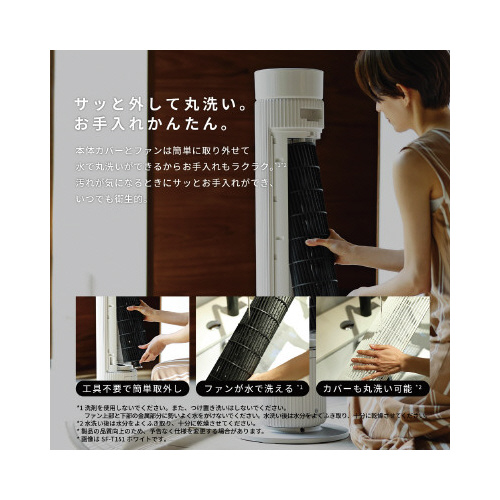 最大約20mまで届くパワフルな風からやさしい風までを1台でまかない、取り外せるファンでお手入れも簡単な「大風量タワーファンビューンタワー」