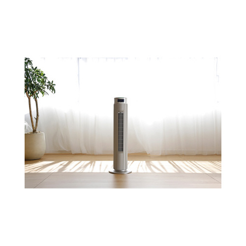 コードレスなのでコードが届かない場所でも使え、置き場所を選びません。部屋の中心に置き、330度首振りで全方位に20m先まで風を届けられる。人に追従して風を届けるので立ち仕事など移動の多い方に便利。