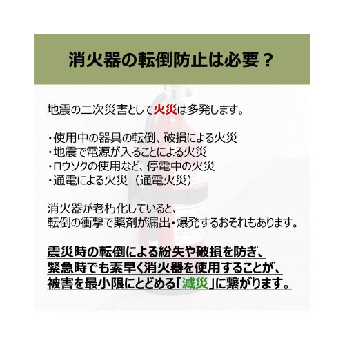 消火器に取り付けて震災時の転倒を防止するベルトです。プレートを壁に接着してベルトを通し、ベルトを消火器に巻いて固定します。面ファスナーのため、緊急時にも取り外しが簡単です。震度7相当に対応しています。