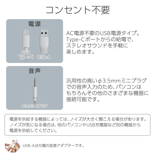 ●入力端子/電源入力:USB Type-C(TM)プラグ(USB-A変換アダプター付属)、音声入力:φ3.5mmミニプラグ