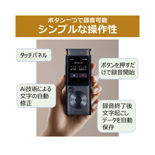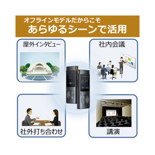 録音から文字起こし迄を1台のみでインターネット通信不要で完結でき、ネットワーク環境や使用場所を選ばず、音声の録音とリアルタイム文字起こしが可能な完全オフラインAIライティングレコーダー