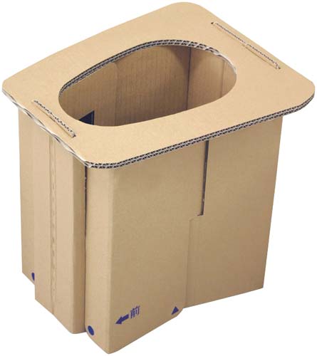 簡単に組み立てられる段ボール製簡易トイレ。水が無くても使えるので災害・断水時の必需品です。耐荷重強度200kg(2重台形構造で安心の強度)。殺菌剤入り、凝固剤で素早く固まります。