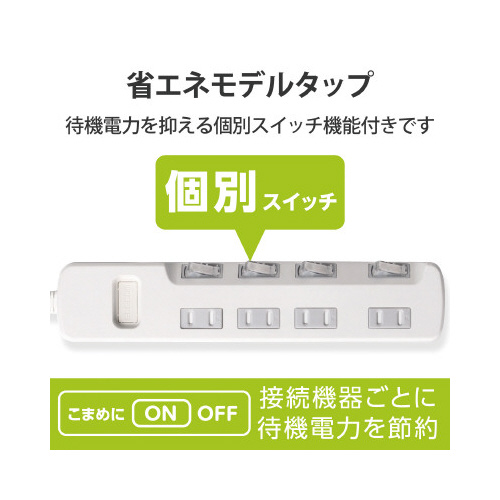 接続機器ごとにON/OFFでき、待機電力を個別に節約できる個別スイッチが付いた省エネタップです。