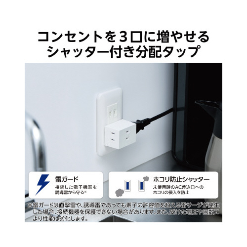 1つのコンセントを3口に増やせる!前面・両側面の3方向から挿せてプラグ同士が干渉しないトリプルタップです。雷ガード・ホコリ防止シャッター付きで安全に使えます。