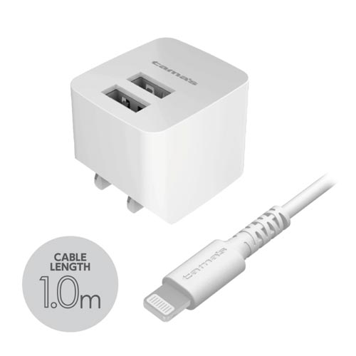 2台同時充電可能!合計最大出力2.4AのUSB-Aポート×2コンセントチャージャー。しなやかに曲がり断線しにくいロングライフライトニングケーブル1m付属。海外でも使える100Vから240V対応