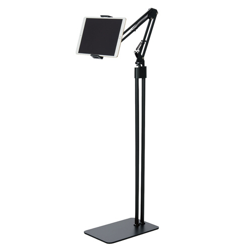 しっかりした台座に装着した支柱とアームによって、広い空間や部屋の中央でも高さを保持してスマートフォンやタブレットを使用できる床置式フレキシブルアームスタンド。
