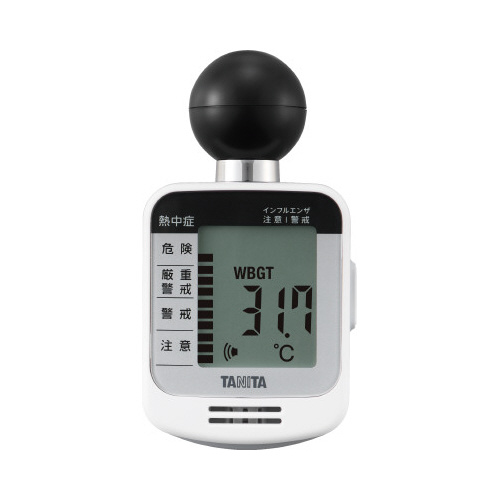 熱中症予防指針にあわせ、「危険」「厳重警戒」「警戒」「注意」の4区分、12段階で熱中症の危険度を分類。危険度に合わせて異なる警告アラーム、インフルエンザ注意機能付きで、防水・防塵機能付きです。