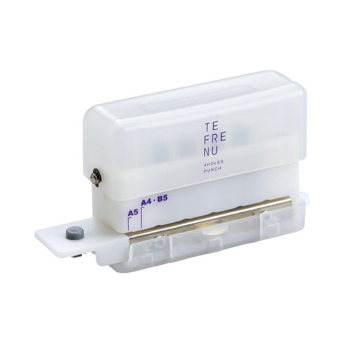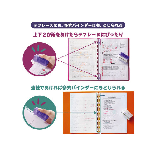 プリントをルーズリーフ仕様にできる、便利な4穴パンチです。上下に4穴のリングが付いたリングノート「テフレーヌ」との相性が抜群で、プリントの上下に穴あけするだけで簡単にとじられます。
