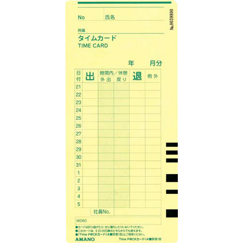タイムパック専用カード4欄タイプです。タイムカードB(20日、5日締め)。