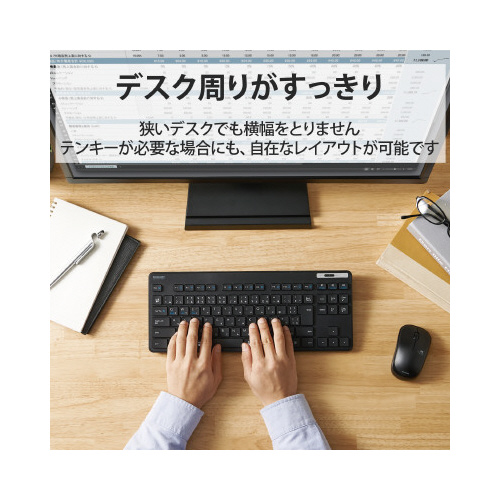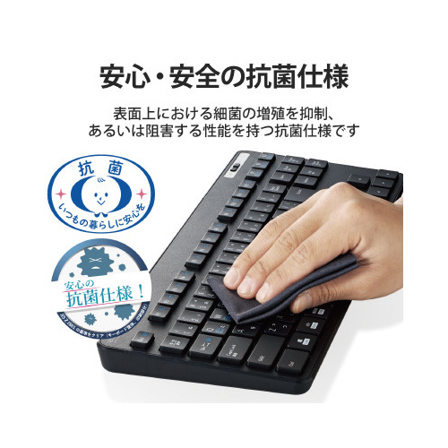 日々のパソコン操作に安心をプラスする抗菌仕様!スマホ・タブレット・パソコンをマルチに接続可能な3台切替機能を搭載したBluetooth(R)5.0薄型テンキーレスキーボード。