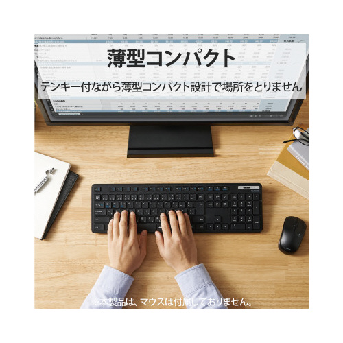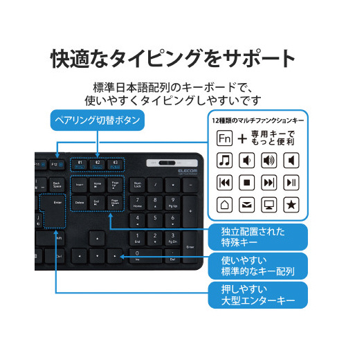 日々のパソコン操作に安心をプラスする抗菌仕様!スマホ・タブレット・パソコンをマルチに接続可能な3台切替機能を搭載したBluetooth(R)5.0薄型フルキーボード。