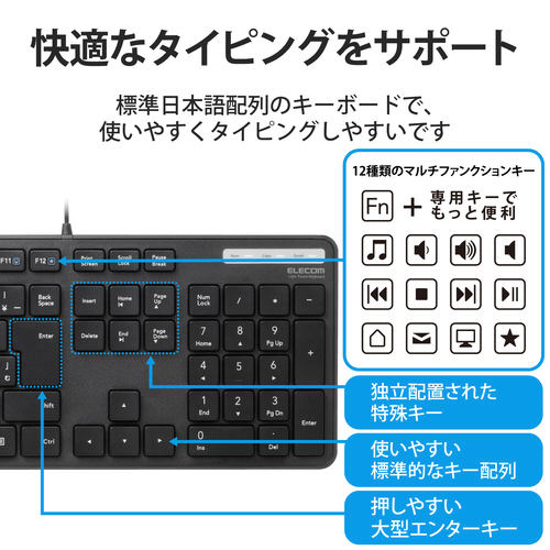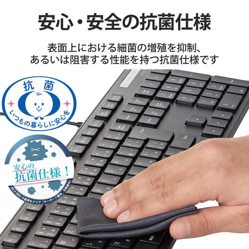 日々のパソコン操作に安心をプラスする抗菌仕様!サクサク軽い打ち心地で、PCに挿すだけで使える有線薄型フルキーボード。