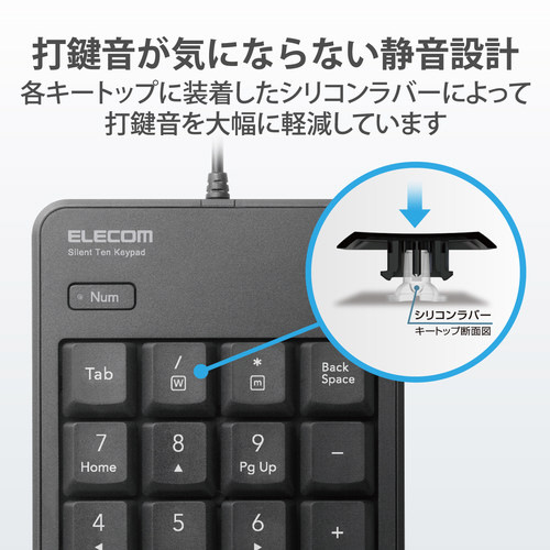 本格静音設計で音が気になる場所や時間帯での使用に最適!さらに、日々のパソコン操作に安心をプラスする抗菌仕様。電池のいらない有線静音テンキーパッド。