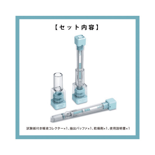 ●付属品/試験紙付き唾液コレクター×1、抽出バッファ×1、乾燥剤×1、使用説明書×1