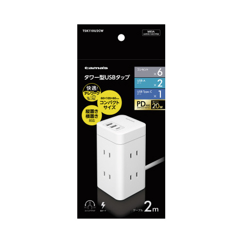 USB-AとTypeーCポート付コンパクト・タワー型電源タップ。狭い場所でも設置しやすい180度スイング可能なコンセントプラグを採用。雷サージから接続機器を守る雷ガードも備える