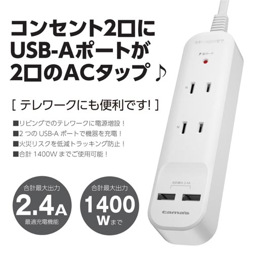 シャッター付コンセント×2+USBポート×2を備えたACタップ。充電器内蔵だからデスク周りもスッキリ。