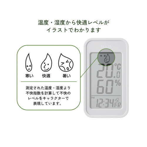 ●表示内容/快適表示(寒い・快適・暑い)カレンダー表示(日付・曜日)時計表示(12時間・24時間切替)アラーム(約30秒、音量:65dB以上)最高・最低温湿度表示