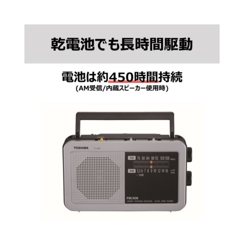 ●電池持続時間/東芝アルカリ乾電池(単1形×3本)使用、内蔵スピーカー使用時:AM受信約450時間、FM受信約400時間、LEDライト点灯時間約1,000時間